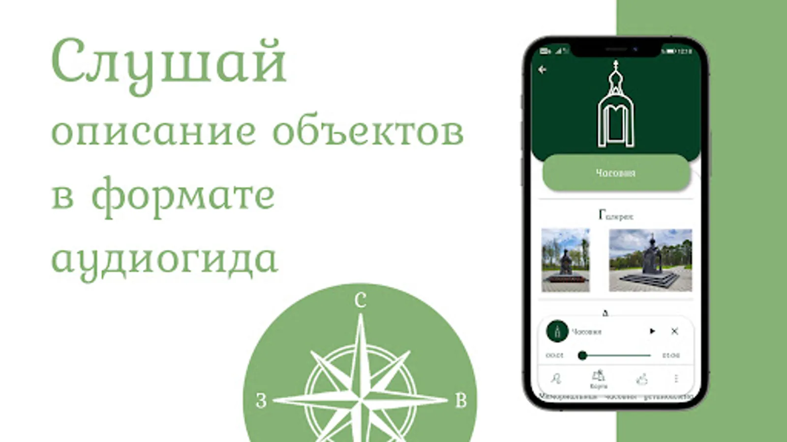Information about some objects is presented in the application not only in text form, but also in audio guide format.