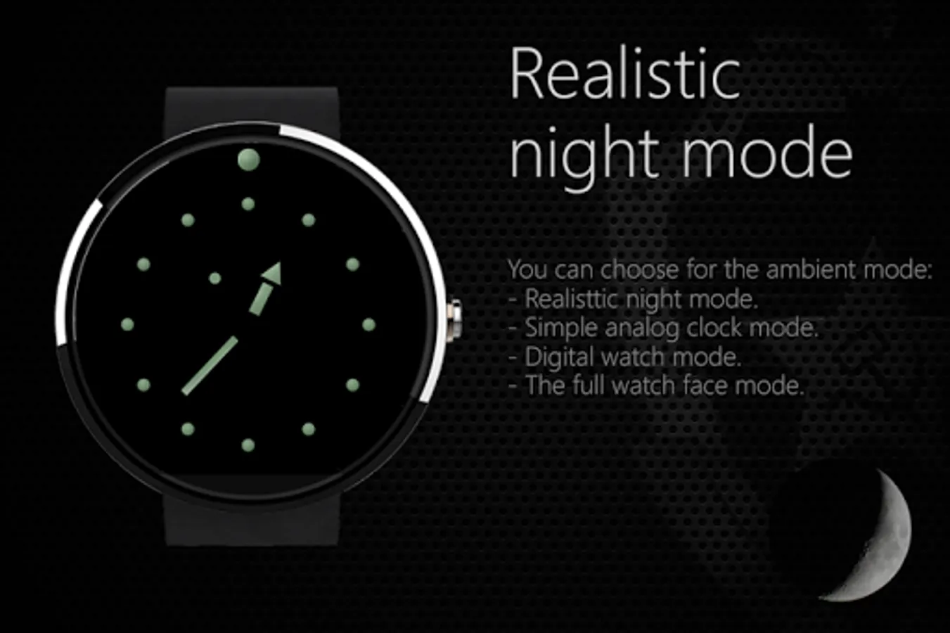 - By default in ambient mode this watch face shows realistic glowing watch face, but you can select one of four alternative modes.