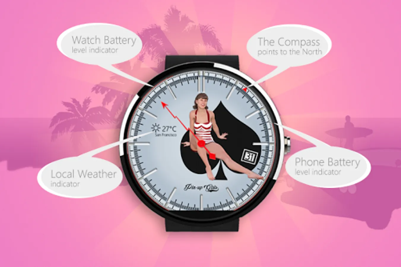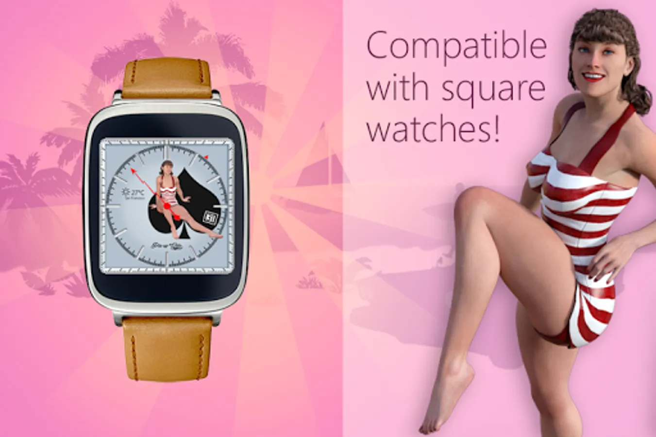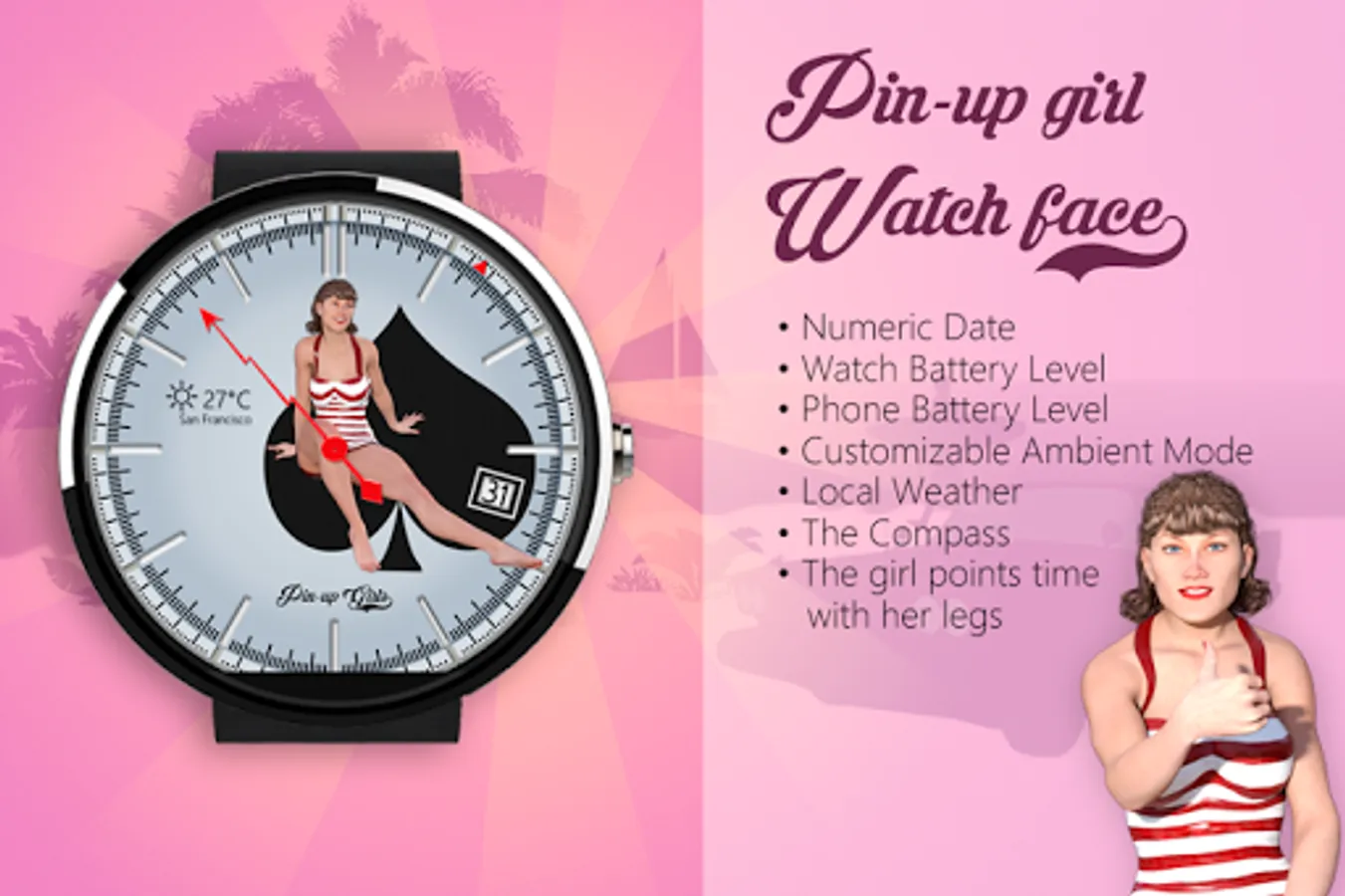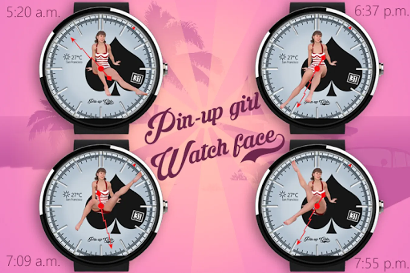 This watch face has no hands. The pretty pin-up-style-girl will show you time with her legs.