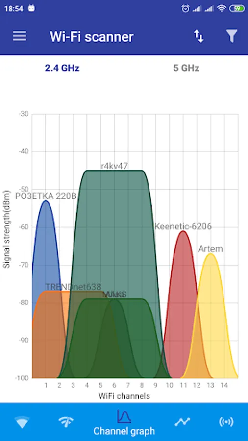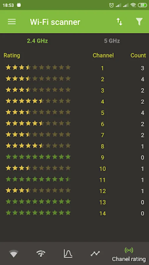 Wi-Fi Scanner will help identify possible network security problems. You can properly scan available Wi-Fi networks in the 2.4GHz and 5GHz bands.