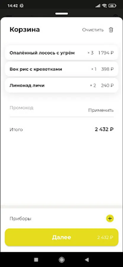 The minimum order amount is 500 rubles (depending on the area), taking into account all discounts. Orders are accepted from 11:00 to 22:45.