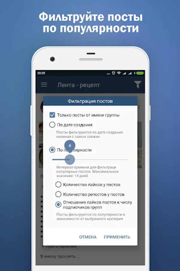* Filtering of posts in popularity for the selected period of time to find the best content