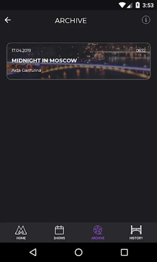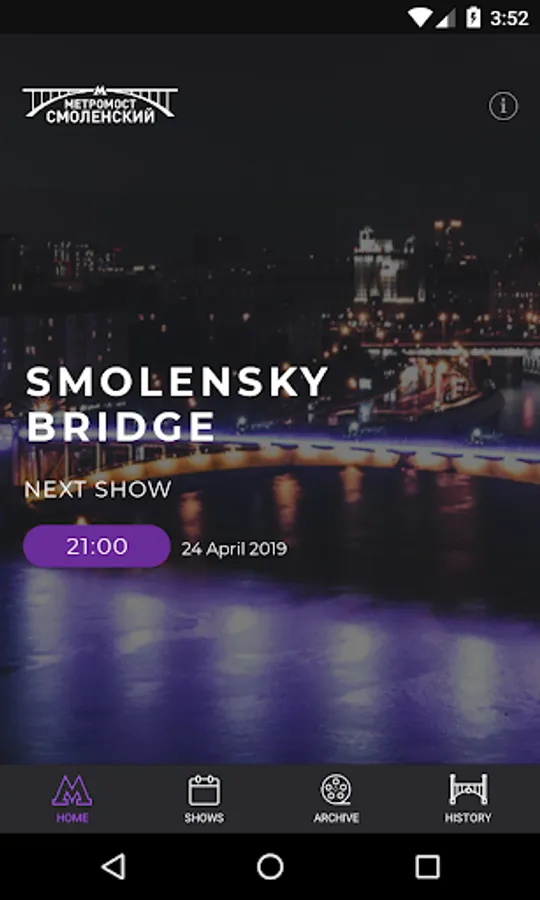 the Smolensk metro bridge. The user can see the schedules of light and music shows as well