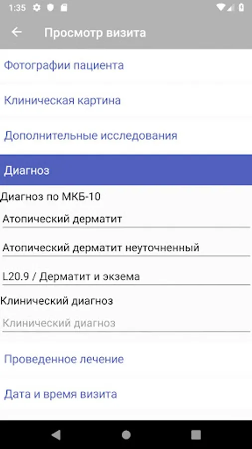 DermaScan for patients app. Developed in conjunction with the Russian Society of Dermatovenerologists and Cosmetologists, it is intended for patients and allows you to photograph and evaluate the dynamics of changes in skin rash elements before / during / after treatment, removed contacting a doctor in case of an increase in skin rash elements, receiving recommendations for contacting a specialized medical organization, he -line. The DermaScan for patients application has the following functionalities: * Authorization - the introduction of a personal login and password pair to gain access to the system;