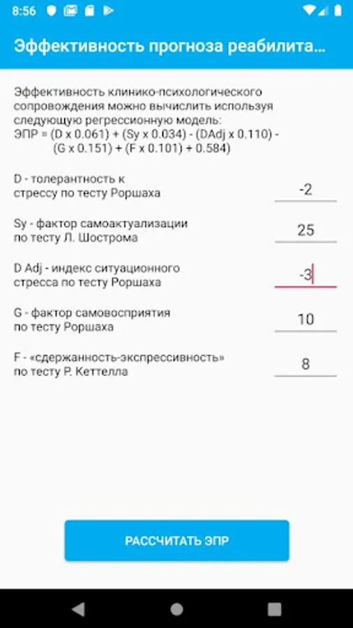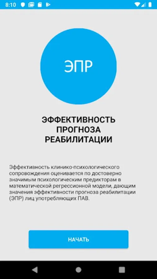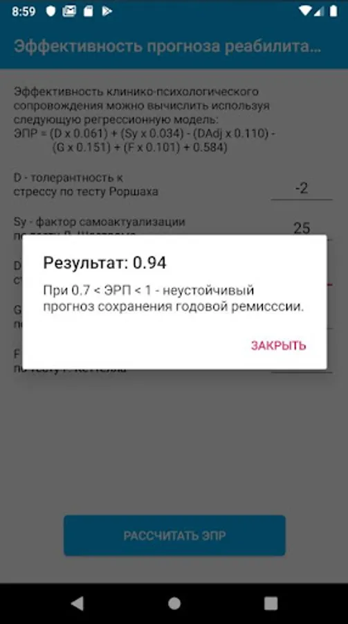 Researchers at the Institute for Innovative Development of Samara State Medical University together with the Department of Medical Psychology and Psychotherapy created a program for predicting the effectiveness of annual remission of dependent behavior of a person according to psychological parameters. To simplify the calculations, the “ERP” application was created, the efficiency of the rehabilitation forecast based on a computer program patented during the study (No. 2016661402 in the Computer Software Register, from 07-10-2016). Economic effect Target corrective effect on negative psychological factors (“targets”) will reduce negative emotional experiences and maladaptive behavioral strategies that support the dependence pattern by about 2-5%.