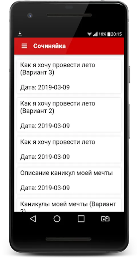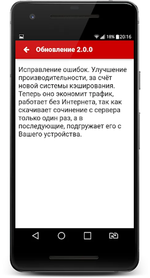The most popular works are collected in the application “Sochinyayka”, which means that in 90% of cases you will receive the material you need. We do not have too much advertising, paid subscriptions and other things. The essays you need are downloaded from the server only once, which means that you do not need to waste traffic every time.