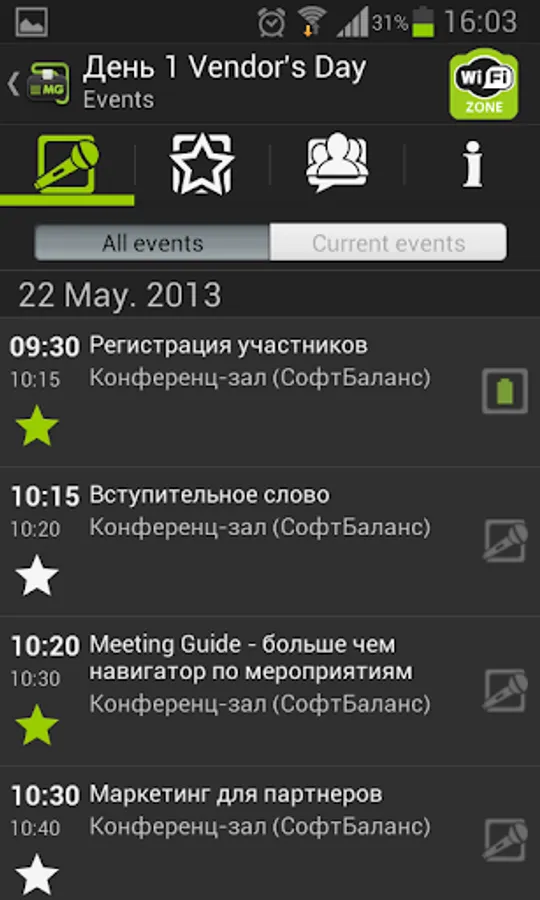 Meeting Guide not only be useful to all those present at seminars and conferences, but also enable advance planning visit activities: convenient function "Add to Calendar" will allow you to fix in advance the upcoming event.