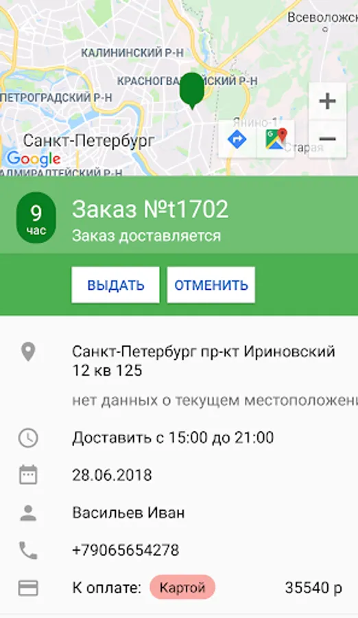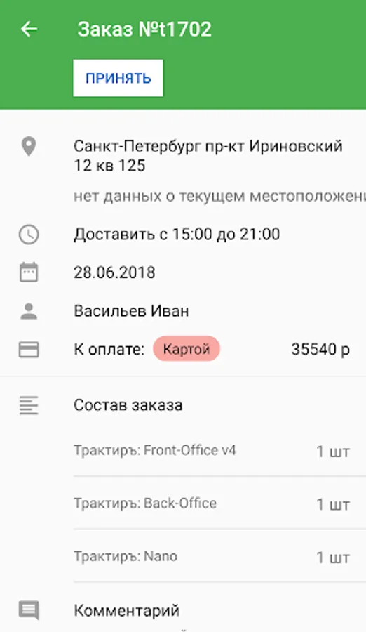 • Creating an order, taking into account the indication of the amount of delivery to the client and additional comments from the courier