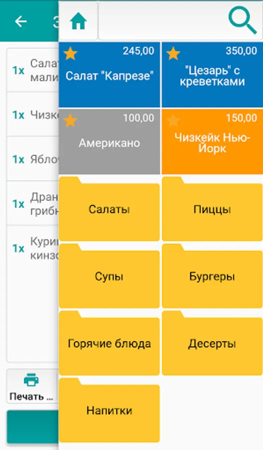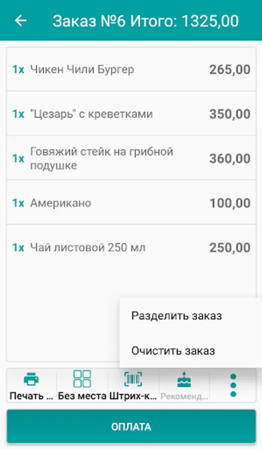 • Working with seats: creating an order for a table, tracking status in relation to a table