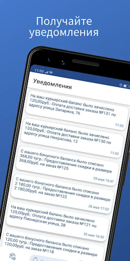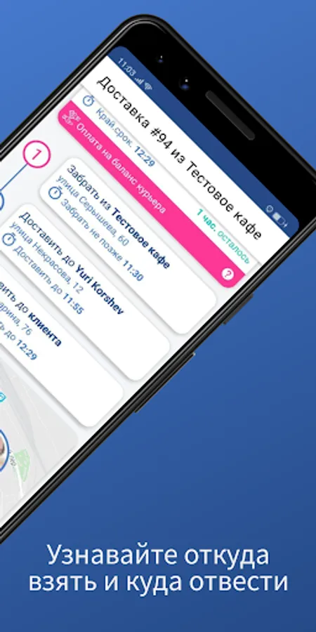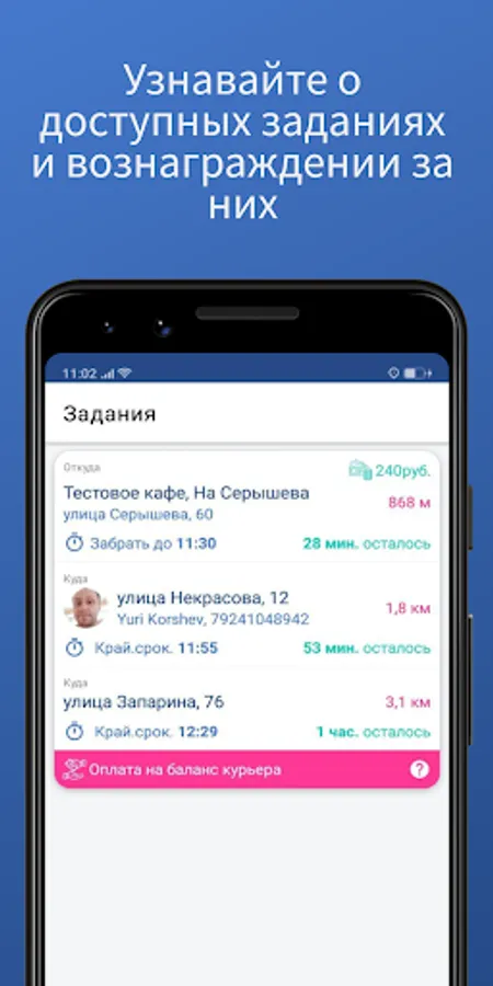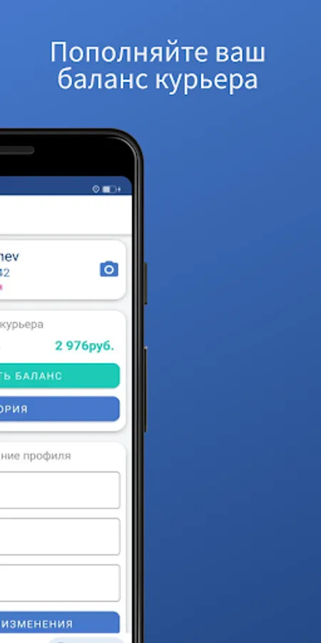 The application allows you to replenish your courier balance with a credit card. Remuneration for delivery is transferred to the courier balance. Funds on the courier balance can be used as collateral for the duration of the delivery of orders from certain companies. Refund and payment of funds from the balance of the courier is carried out only at the office upon presentation of a passport.