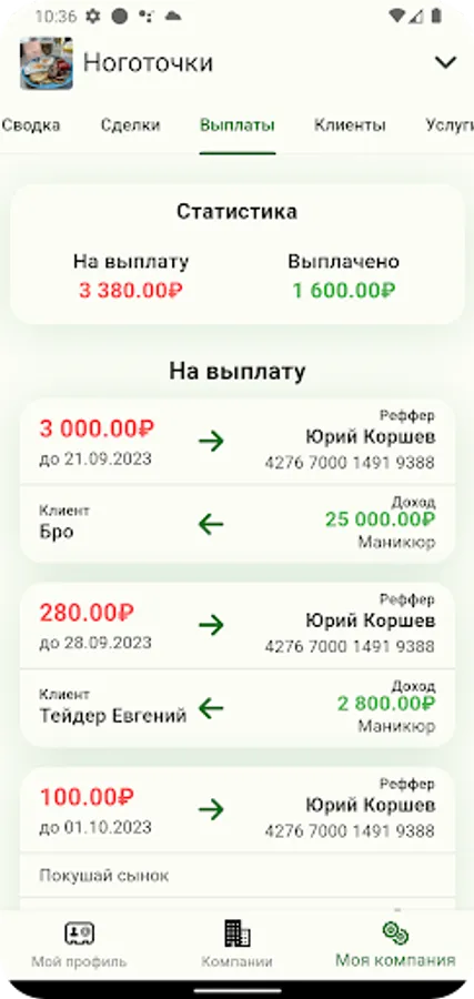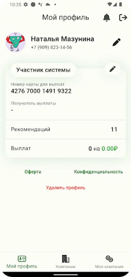 The payment of referral remuneration between the company and the system participant occurs outside of this application and is carried out through a bank transfer (from card to card or via SBP). Application administrators undertake to block those companies that refuse to pay rewards to system participants for referred customers.