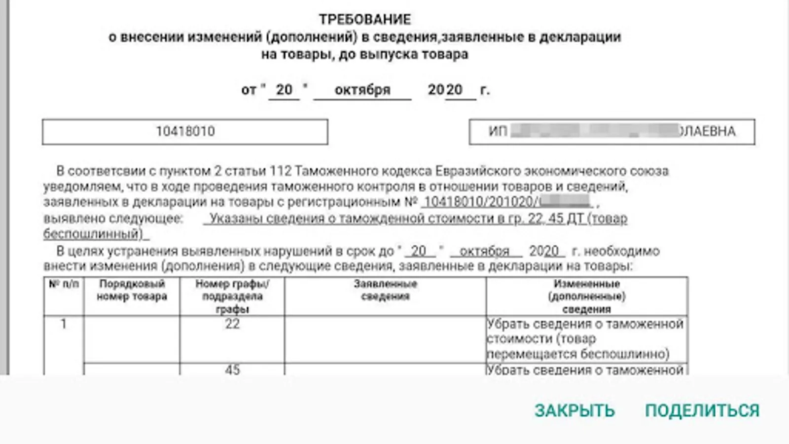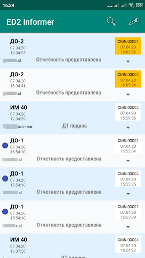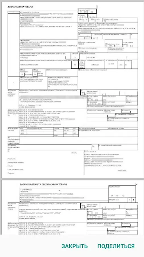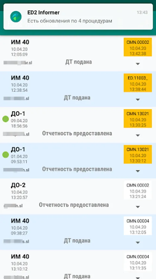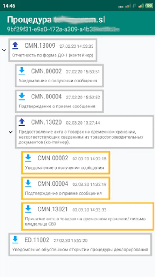 The main screen of the application displays brief information and statuses of your DT and DO1, DO2. By tapping on a list item, the complete history of ED2 for this procedure is displayed. You can view individual messages that can be shared with interested parties (carrier, recipient, other company employees). Updates to declaration procedures are accompanied by customizable pop-up messages.