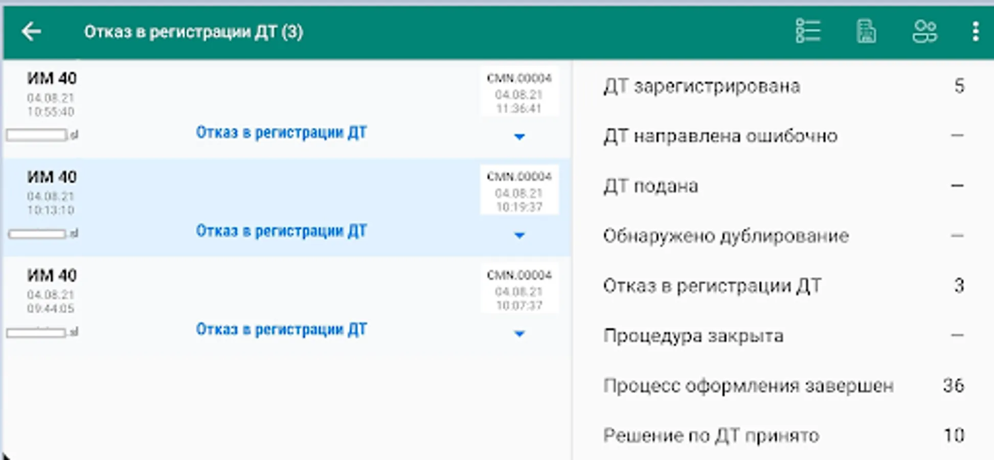 In the "Summary" view mode, operational information on DT registration is displayed, grouped by statuses. Messages can be filtered by statuses, organizations, declarants.