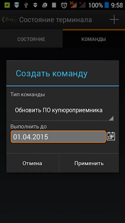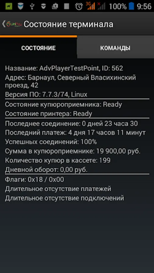 The application allows you to receive data about the state of the terminal and its peripheral devices, the amount of cash received, as well as track the problem terminals. The application displays the agent terminal, a user is logged on. In addition, depending on the problems arising at the terminal may try to resolve it remotely using the functionality of sending commands.