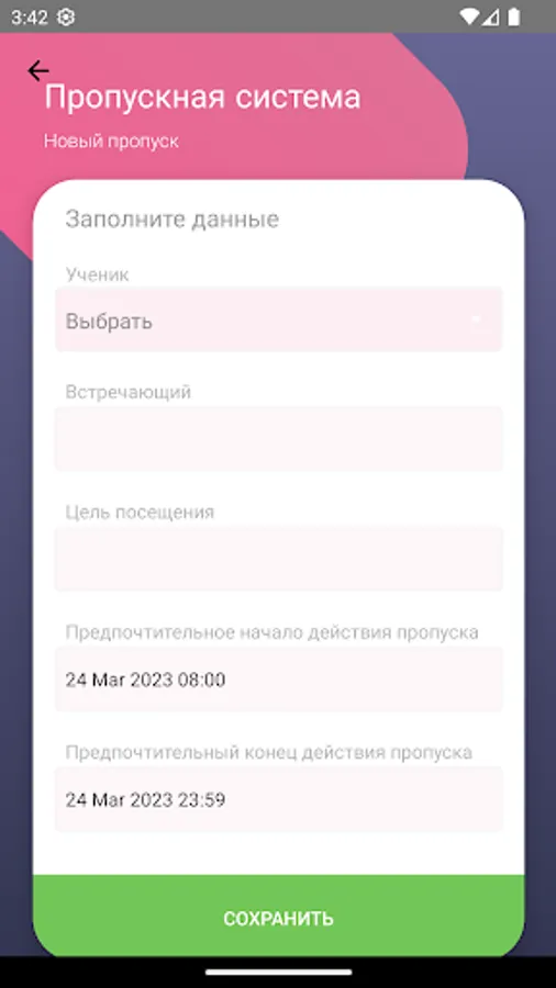 The application is intended for ordering a pass to school by the parents of the students of the school.