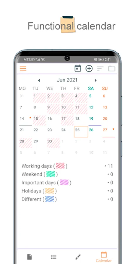 5) Calendar with active functionality in the form of text entries for certain days, marking days (work, weekend, important, holiday, miscellaneous), the ability to assign a reminder for a specific date.