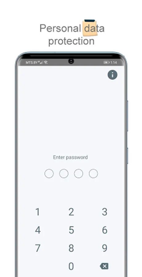2) Pin - code (password) for the application. It is convenient in that access is denied to the entire application, and not to individual data with general open access. To increase the degree of security against hacking by unauthorized persons, your password is not saved anywhere and, accordingly, its recovery is not possible in any other way, except by entering the correct combination! Therefore, be careful when choosing a pin code. If you forget it, it is not possible to restore information stored locally (in the application)!