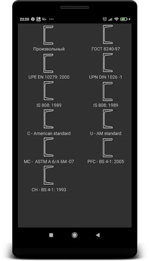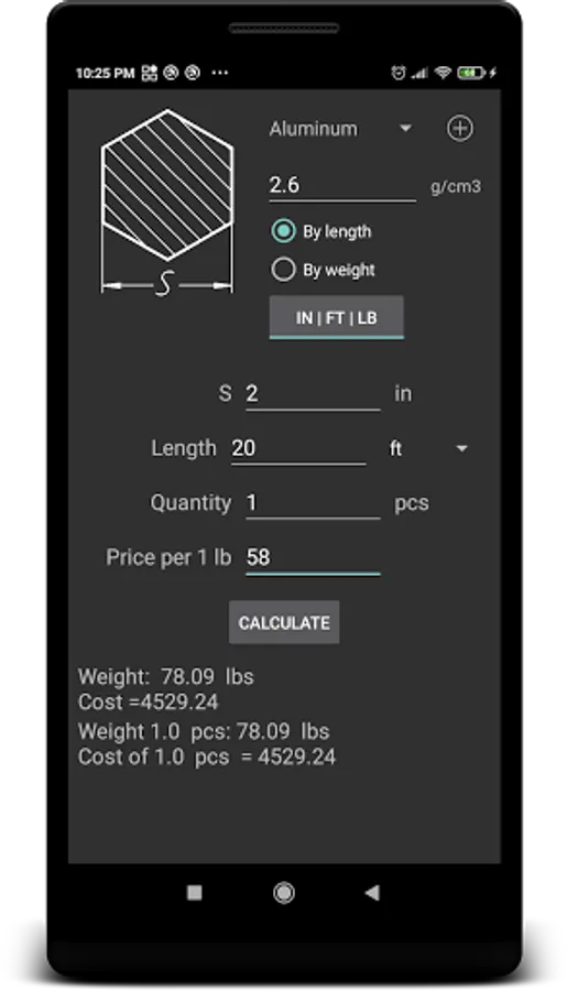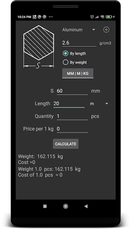 The application allows you to calculate the mass of products from metal knowing the length, or the length of knowing the mass.