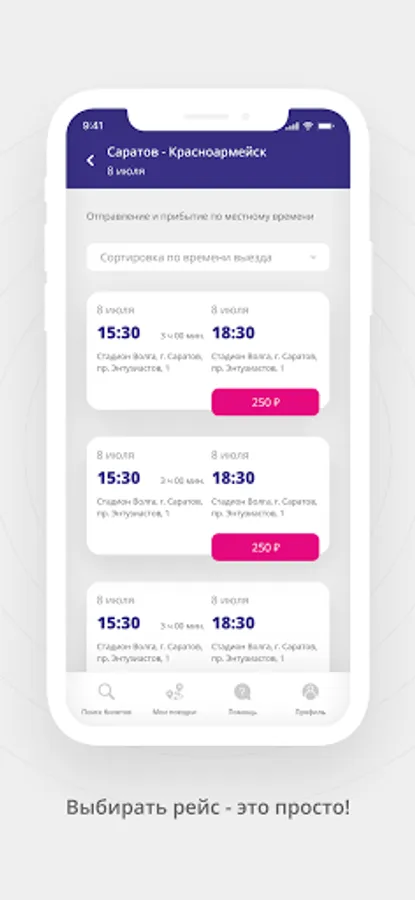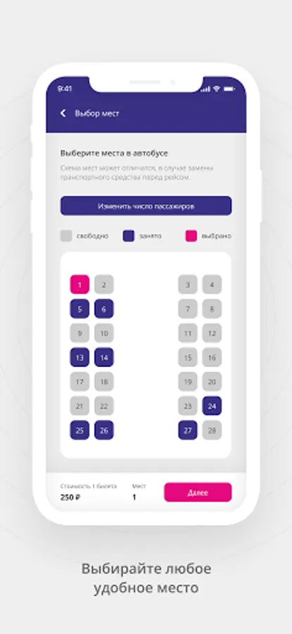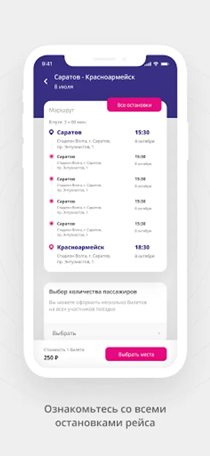 - Select the point of departure and arrival, view the current bus routes and choose the one that suits you;