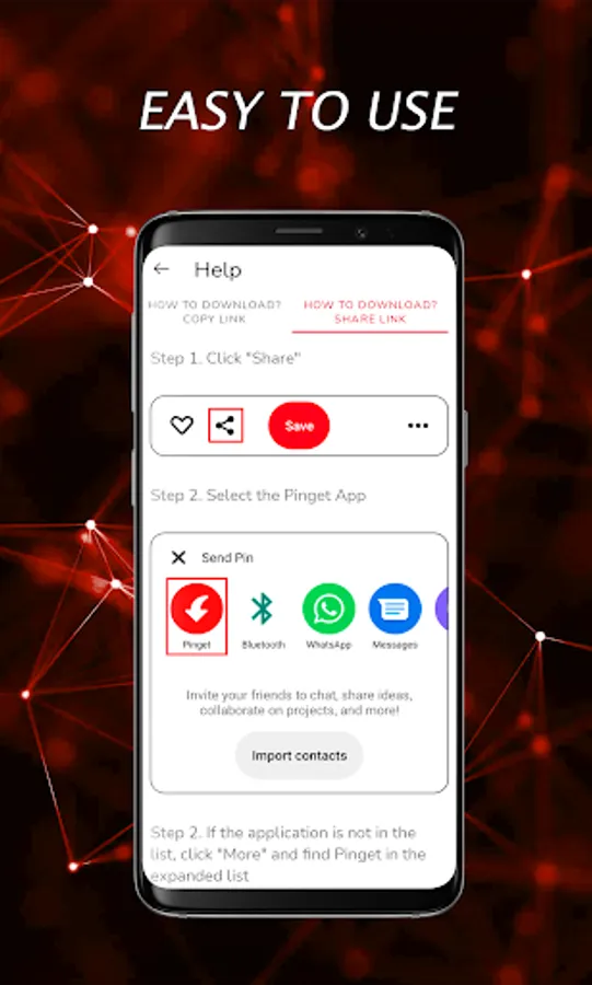 1) Open the menu and click "Copy Link" and then go to the Pinget app and click on the "Download" button.