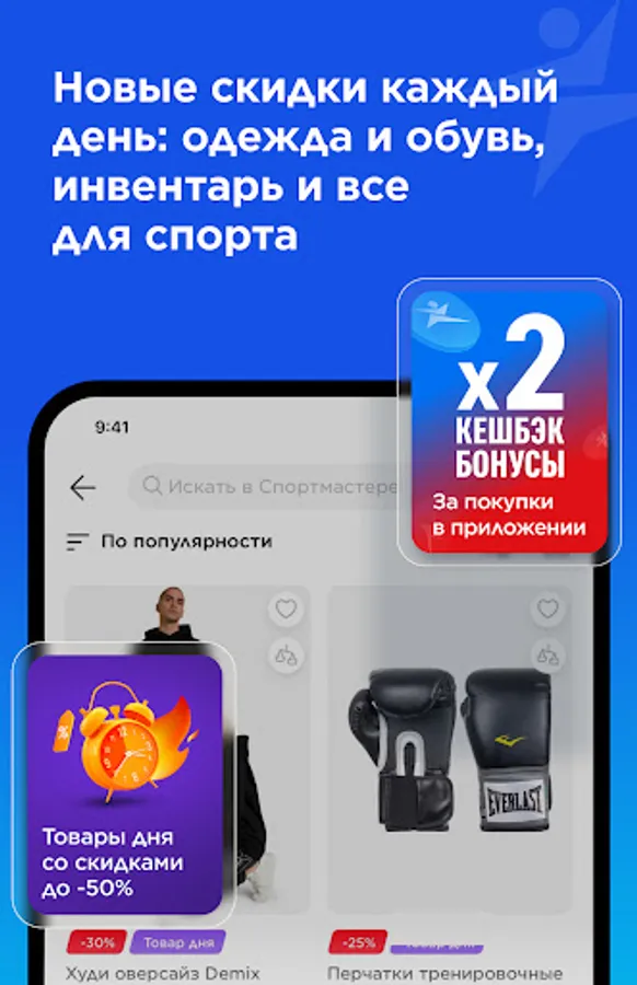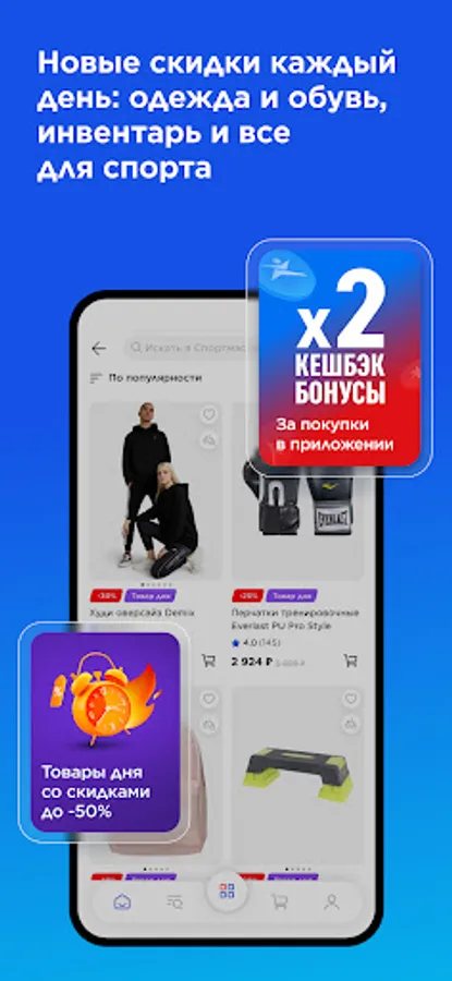 Get twice as many cashback bonuses for purchases through the Sportmaster mobile app.