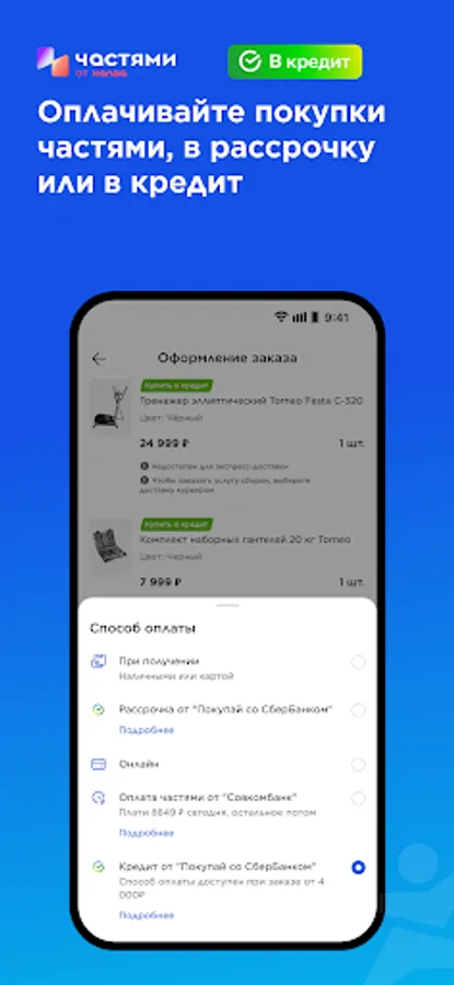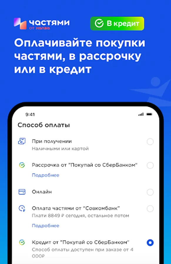 • Various payment methods: online, SBP, pay on delivery, installments and credit.