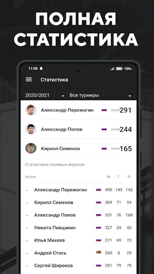 • Full statistics of all matches of the tournament in real time, as well as player statistics;