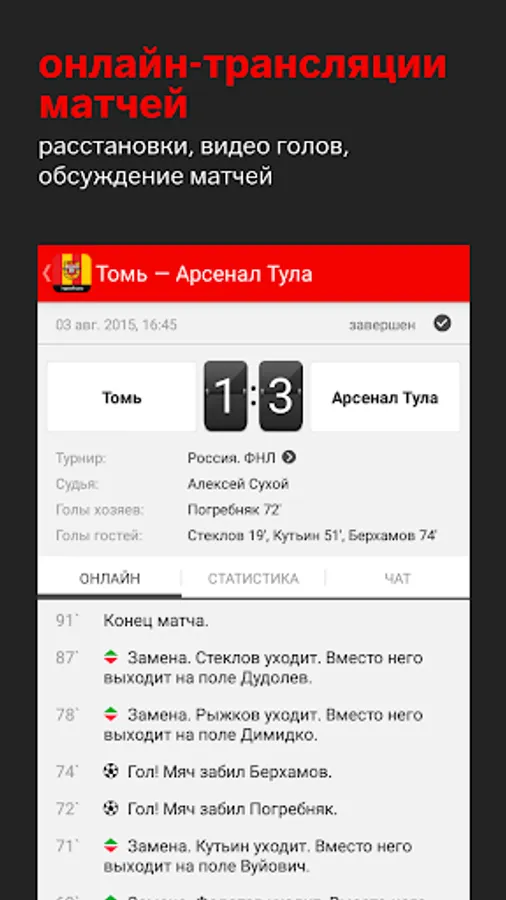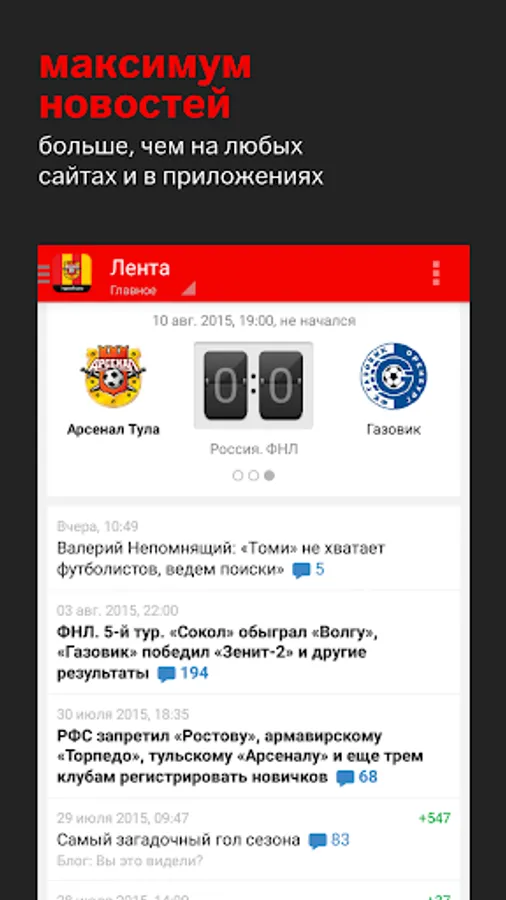 Arsenal Tula by Sports.ru is the best app for fans of the Arsenal Tula football club playing in the RPL. Match results and calendar, text broadcasts, news and videos - everything about your favorite team, quickly and in detail. Tracking Arsenal has never been so convenient.