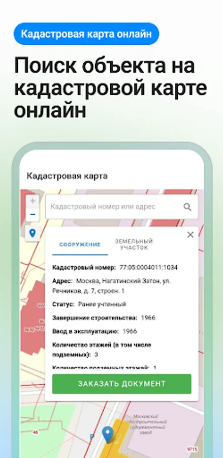 Cadastre ru is an information and analytical service for obtaining comprehensive information about real estate. In the application, you can view open public information about a property from Rosreestr for free. Also in the application it is possible to order a comprehensive report on the characteristics of the property and the transfer of ownership. The service will collect information about the object and owners from various sources, assess the risks for the buyer of real estate and prepare a consolidated report.
