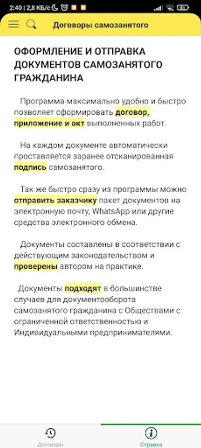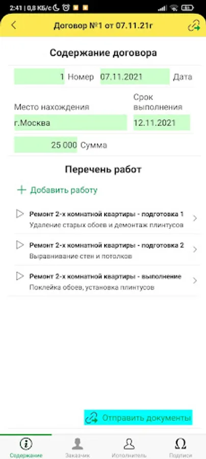 The program most conveniently and quickly allows you to form an agreement, an application and an act of work performed in accordance with the law. And you can immediately send it to a legal entity.