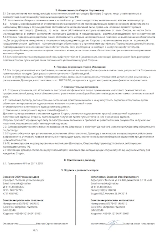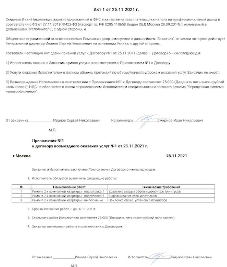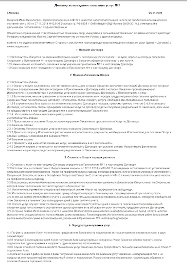 The documents are drawn up in such a way that they are suitable for any type of activity of the self-employed. In order for the texts of the documents to be universal, the content of the work, the deadlines and the amount are included in Appendix No. 1 to the contract.