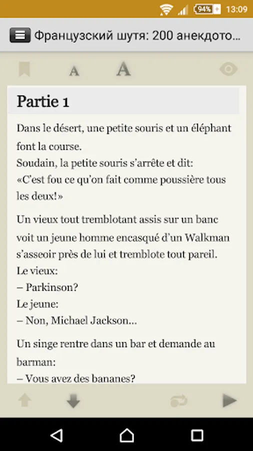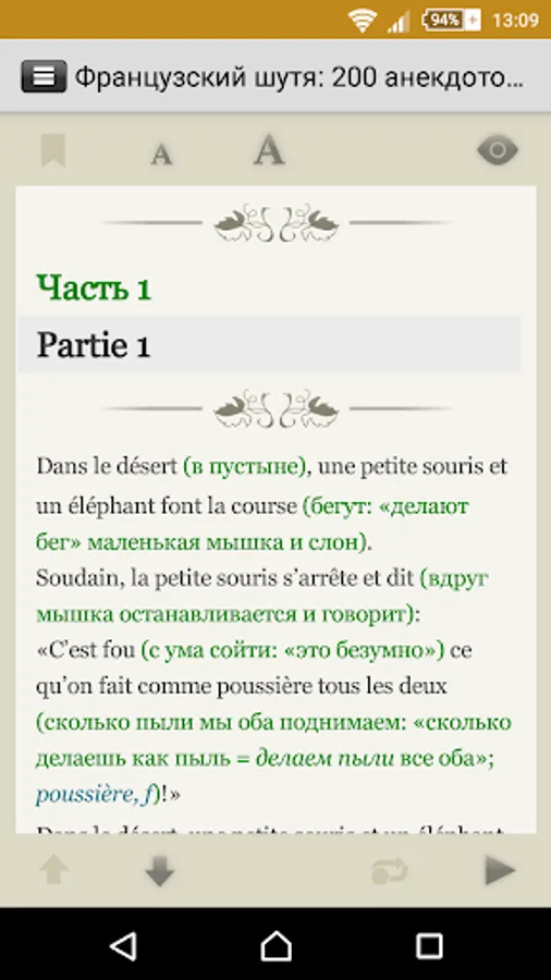The application includes two hundred contemporary French jokes, adapted (without simplification of the original text) method Ilya Franka®. By reading and listening to stories in French, you will meet with a lot of commonplaces of colloquial phrases and turns of modern French language.