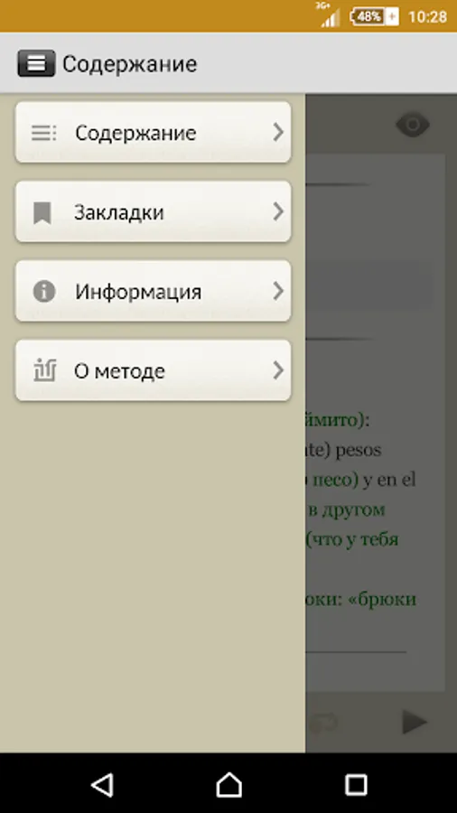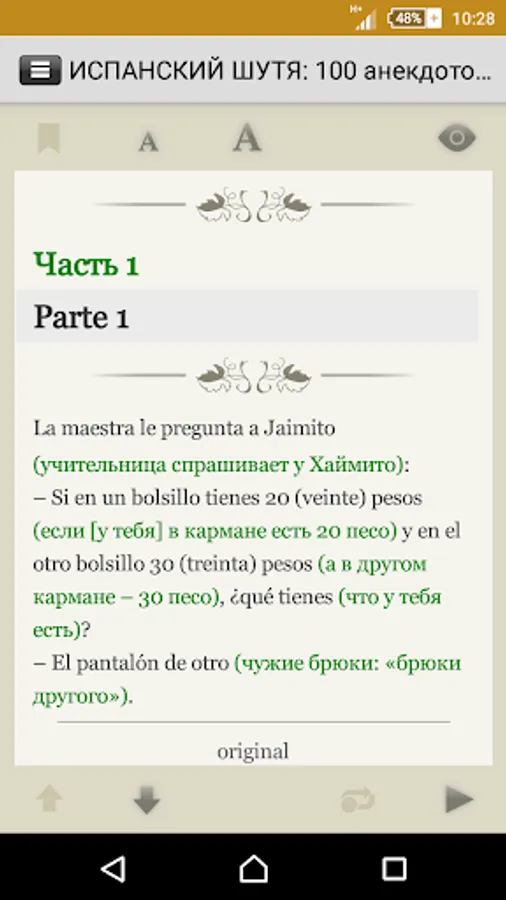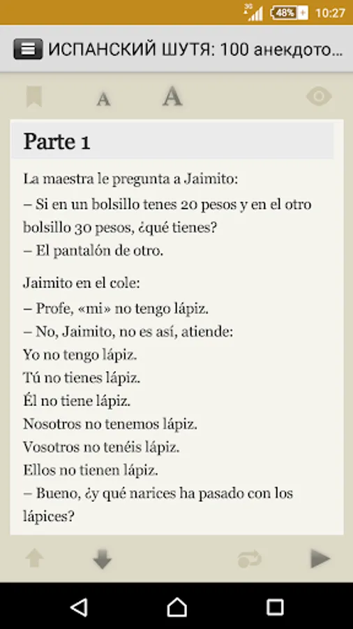 The application includes a hundred contemporary Spanish anecdotes, adapted (without simplification of the original text) method Ilya Franka®. Reading and listening to jokes in Spanish, you will get acquainted with a lot of commonplaces of colloquial phrases and turns of contemporary Spanish language.