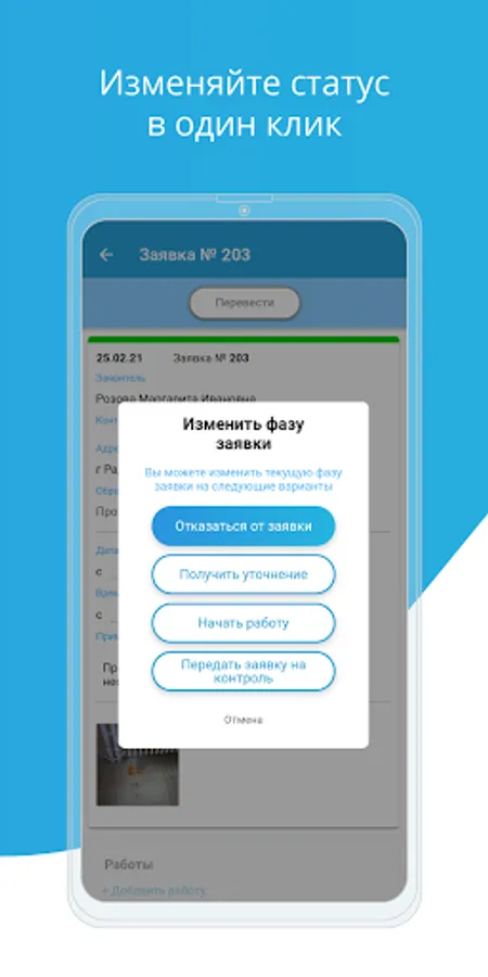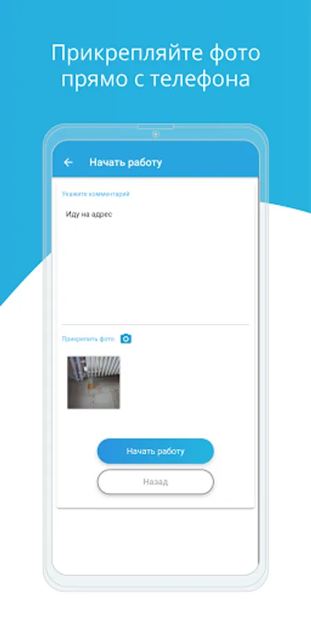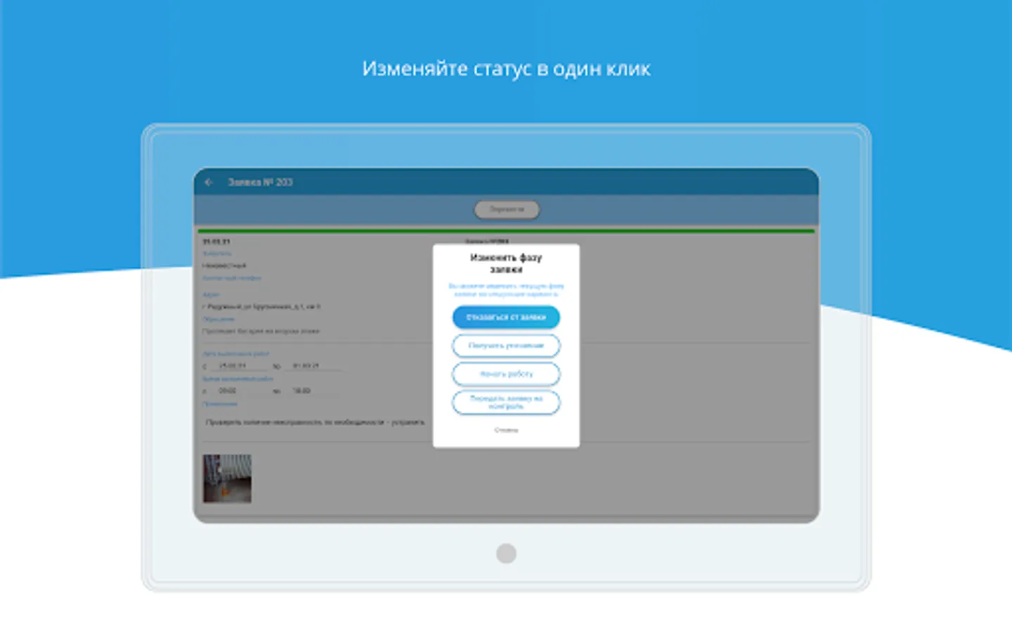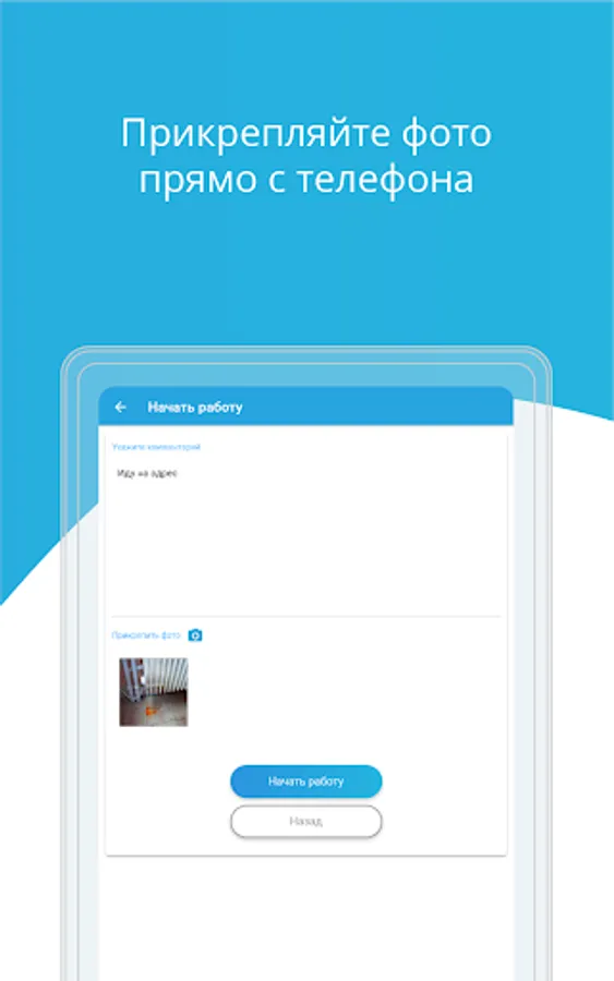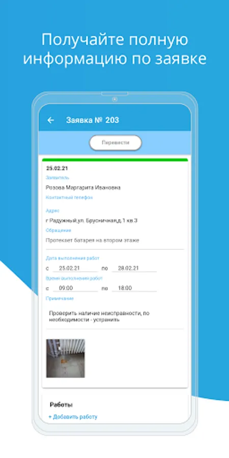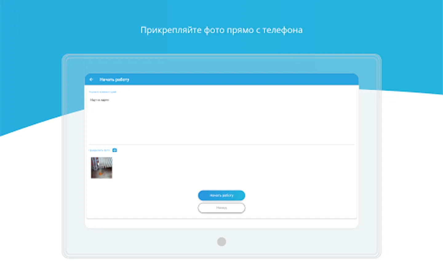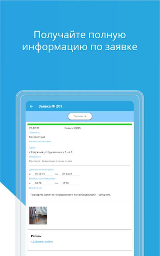 The application allows the foreman in real time to receive information about the work received, enter data on the application, attach a photo as confirmation of the completion of the work.