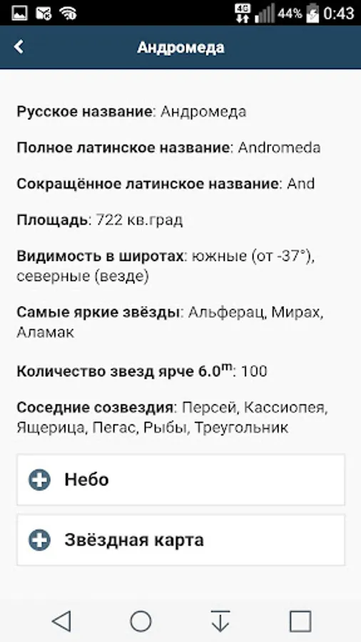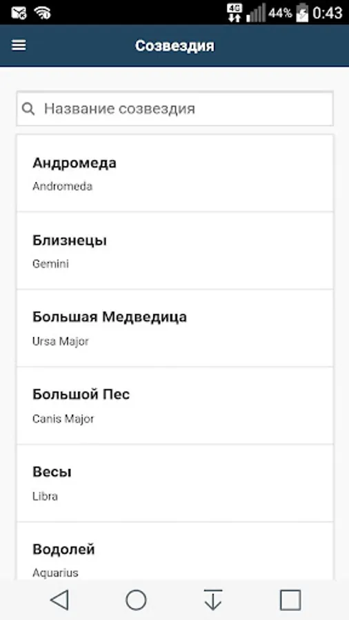 The application is a reference tool which contains a list of all existing constellations on the celestial sphere in the solar system.