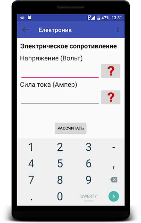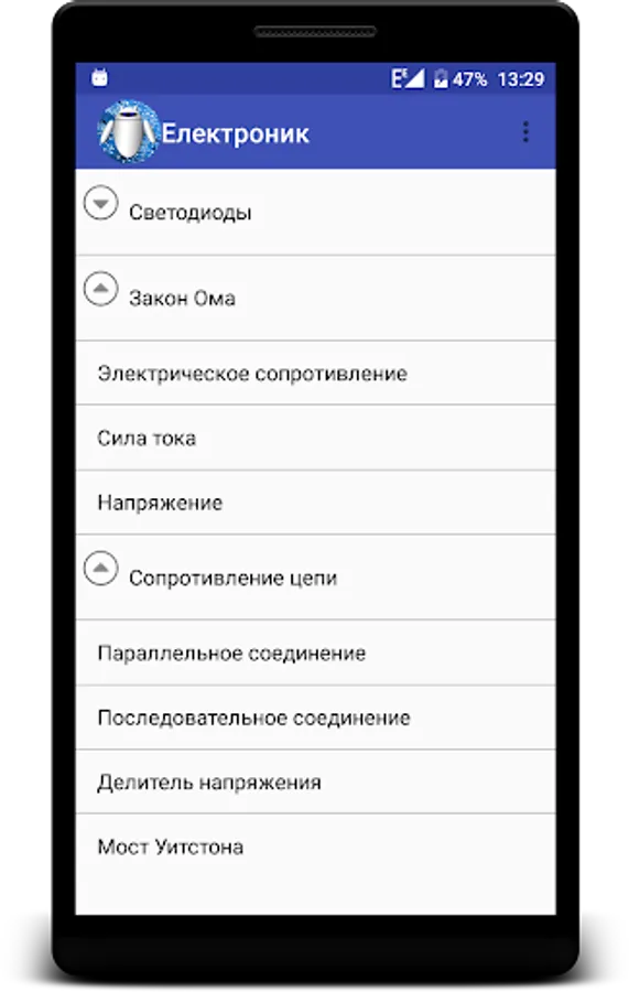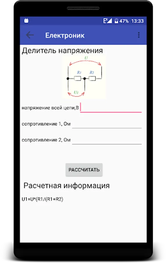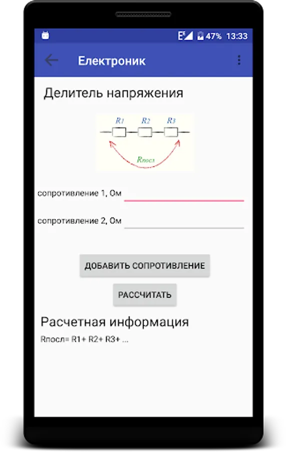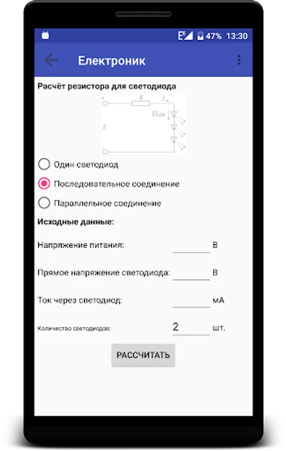 The application allows the user to easily and quickly make calculations using formulas Ohm's law, resistance of the circuit, as well as calculations for connecting LEDs.