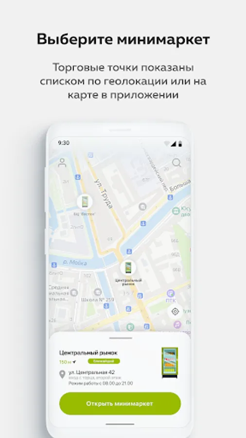 1. Select an outlet. Sales outlets are shown in a list by geolocation or on a map in the application;