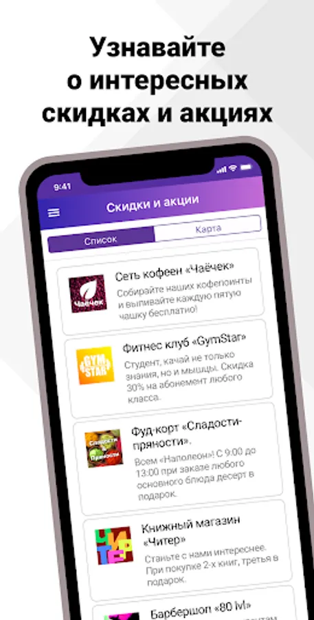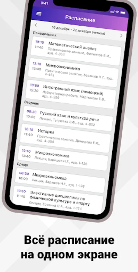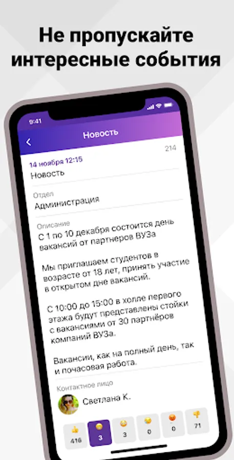 Section and notifications of news and events at the university, with the ability to sign up for an event or leave a reaction to it.