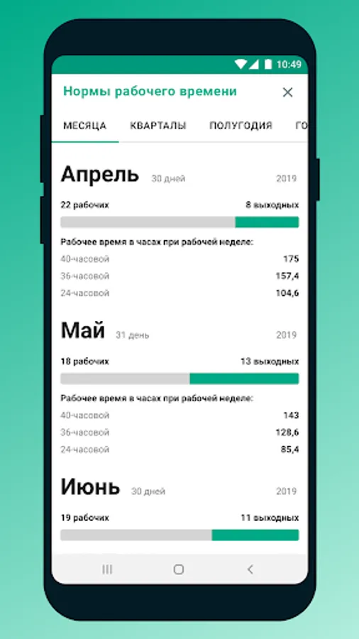 Exact data on workers, days off and reduced days, number of working weeks and norms of working time per month, quarter, half year and year with 24, 36 and 40-hour working week according to the norms of the Labor Code and resolutions of the Government of the Russian Federation.