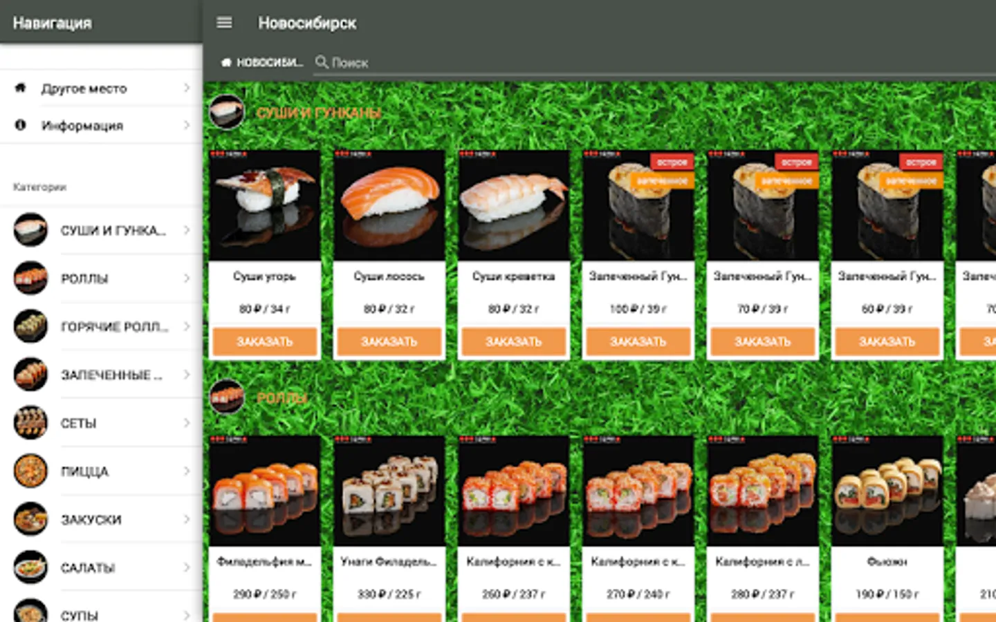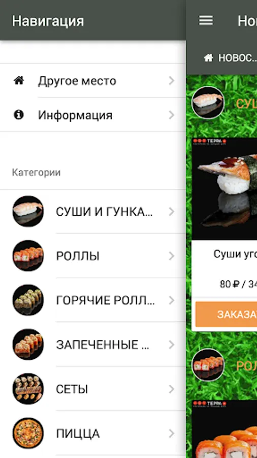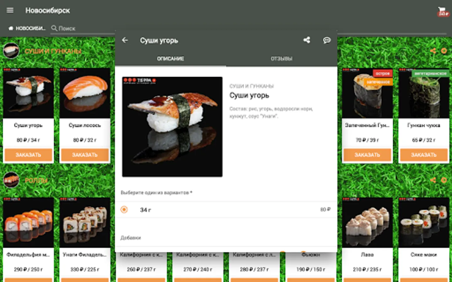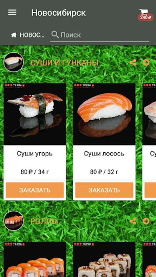 Application for ordering rolls, sushi, pizza, pasta, wok, salads, soups and other dishes in the network of restaurants "Terra" in the cities of Novosibirsk, Omsk, Kemerovo, Krasnoyarsk, Surgut, Novokuznetsk, Taiga.