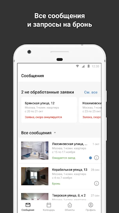 In the application, you can process all incoming requests: offer a guest to rent a house or send a refusal. Use the convenient management of your reservations and track their current status: booked, canceled, prepayment awaiting, etc.