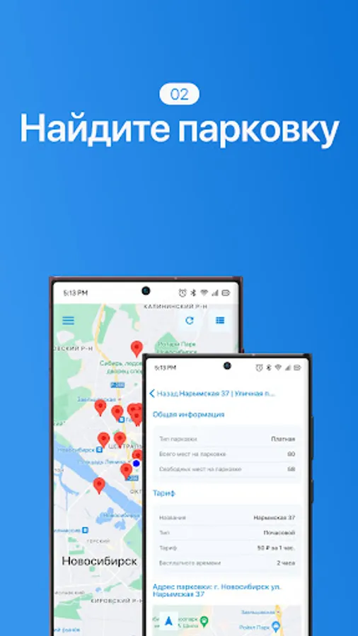 The application contains a parking map - all available parking lots of the city are displayed with a description of the conditions (cost, number of places, etc.).