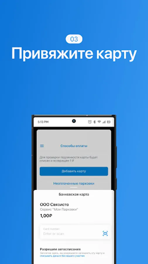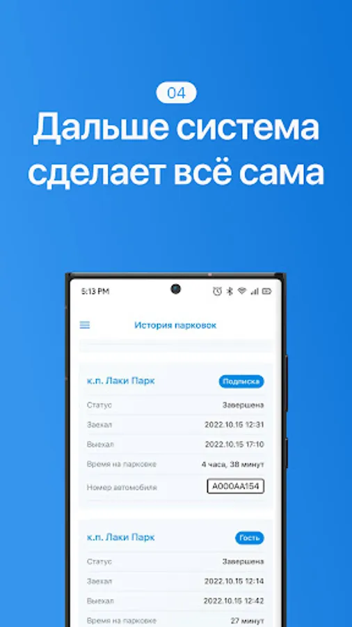 Authorization of users is carried out by phone number. The user registers the number of his vehicle in the application, binds a bank card.