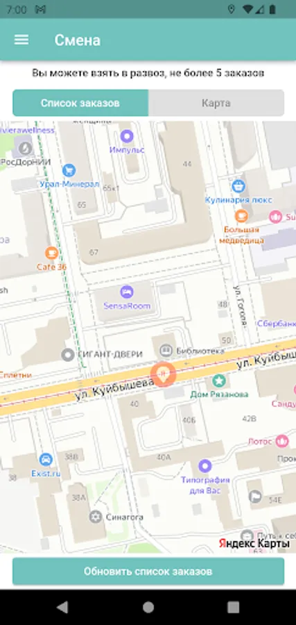 To get started, you need to download the application, register, wait for the manager to activate your account and select a restaurant to start your shift. Delivery orders can be selected from the list, forming the load yourself.