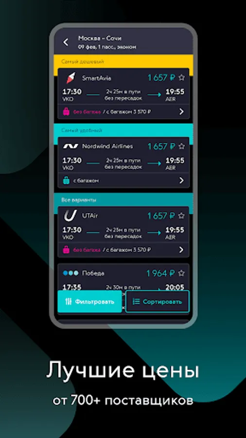 Offers from more than 700 Russian and foreign airlines are available. There are regular and charter flights, as well as special rates! To choose the best flight option - convenient filters and sorting: by price, flight duration, number of transfers, departure time.