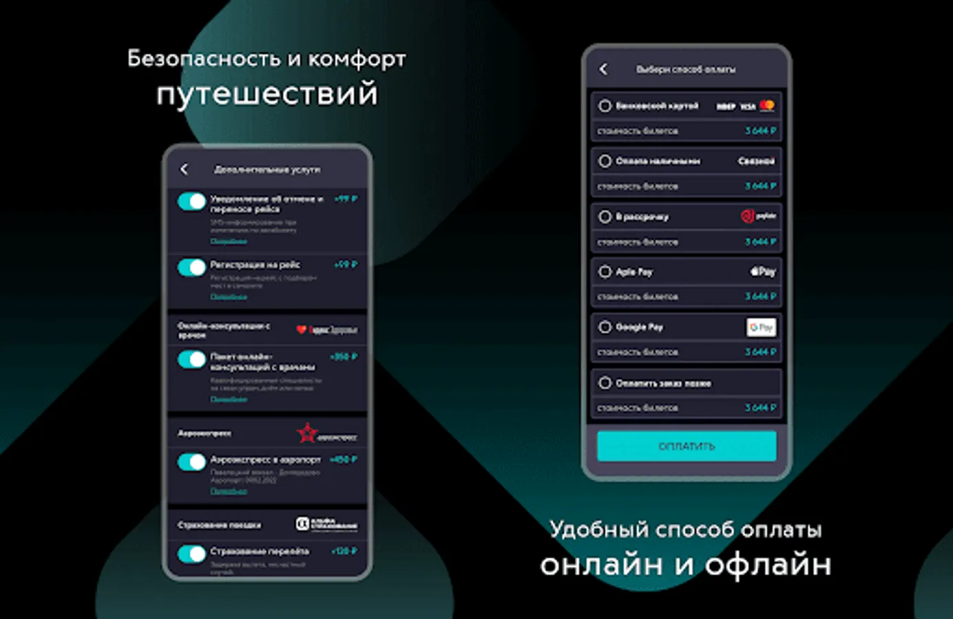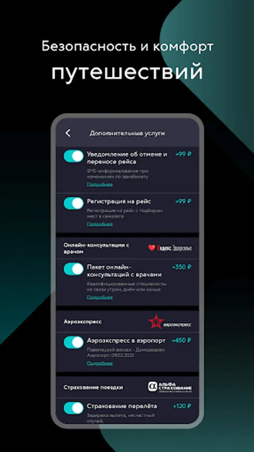 • Insurance and other useful options: getting an insurance policy in case of delayed departure, accidents and loss of luggage, as well as an insurance policy for those traveling abroad - right in the application.