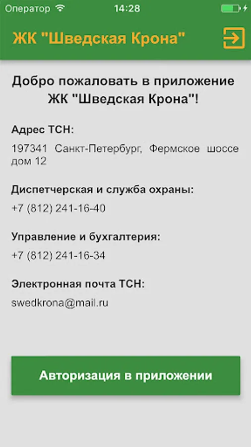 The application is designed for tenants and owners of premises in the residential complex "Swedish Krona" (Saint-Petersburg).