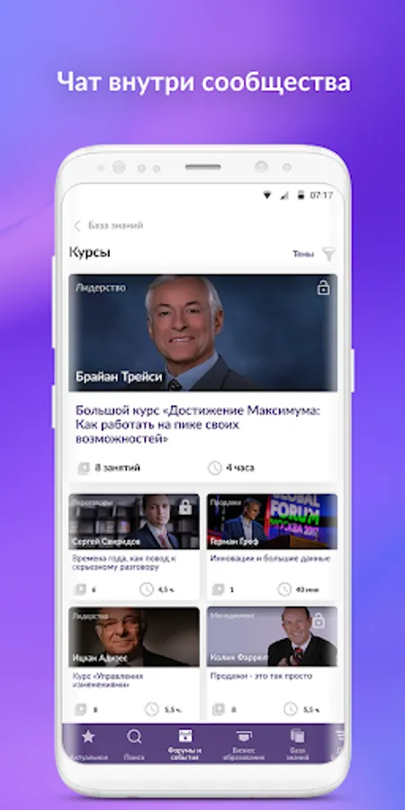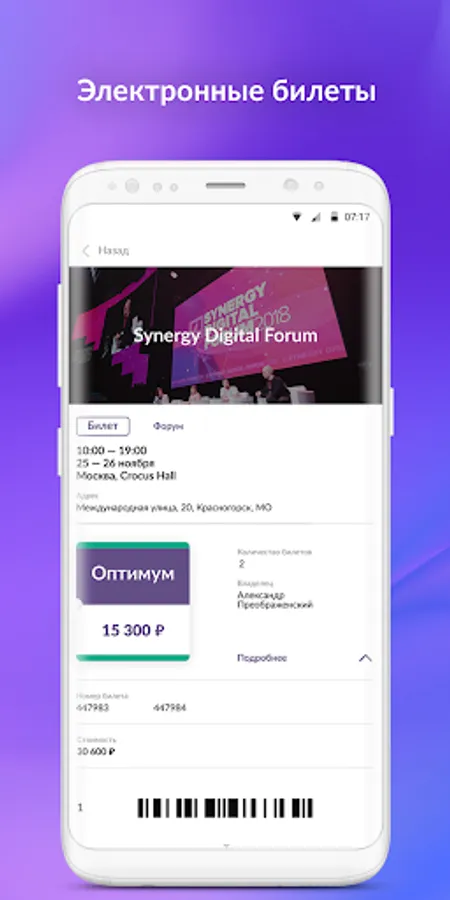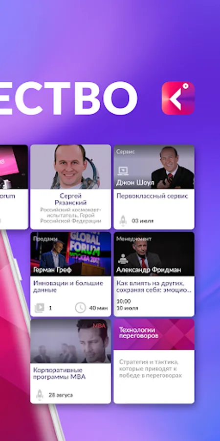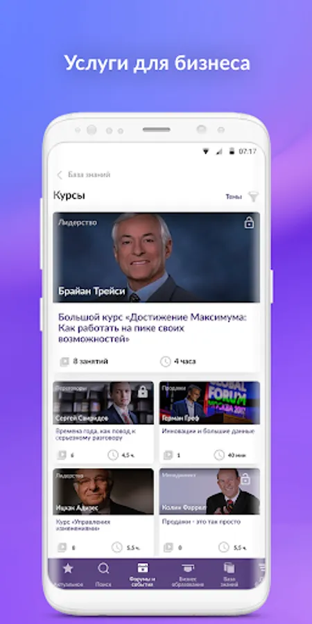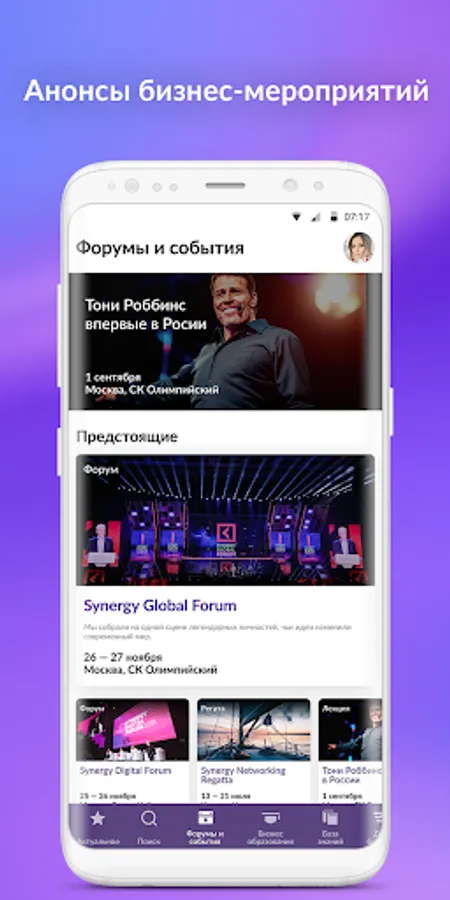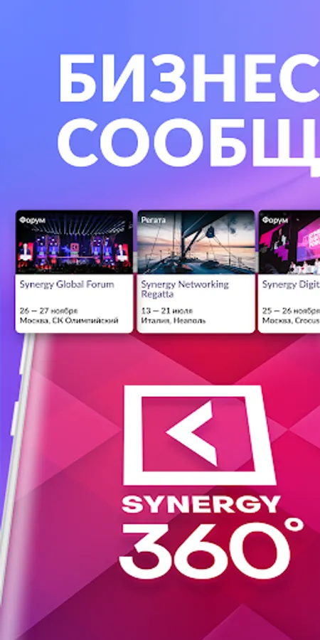 Posters of events, training courses, video materials from leading business speakers, services for your business - all from Synergy. And also a closed messenger "only for their own." Here you can find like-minded people, potential customers and colleagues. Electronic tickets for events in the application.