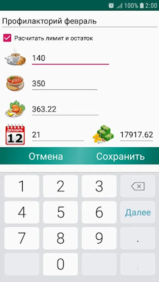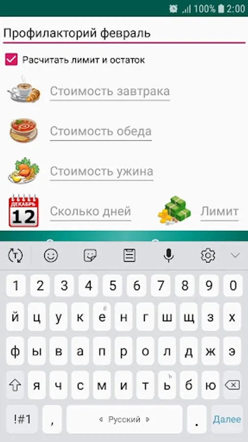 The Application “Profic Balance” DOES NOT ABLE to keep complex accounting records, and is intended solely for quickly entering checks into the local database, calculating the amount, as well as the remainder of the limit set by the user.