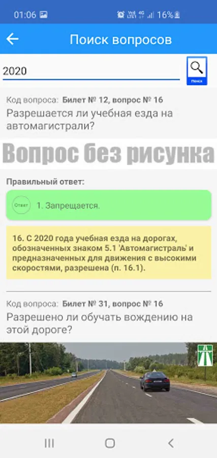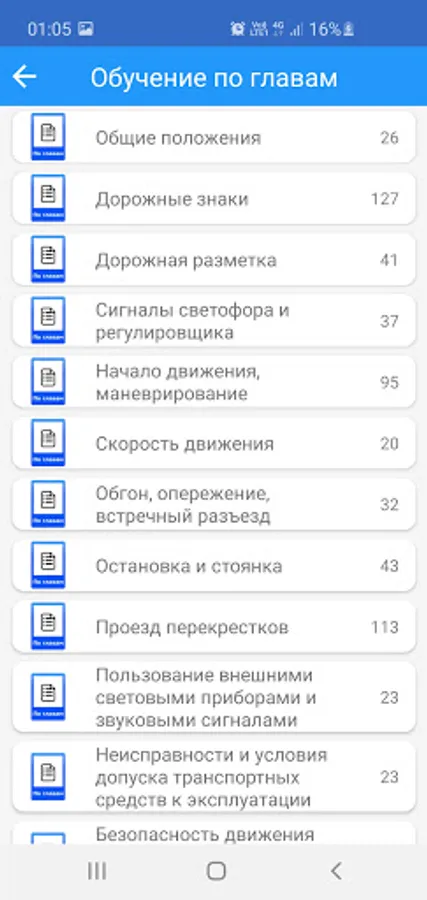 - 3 training modes. Questions are selected by chapters, by tickets and randomly